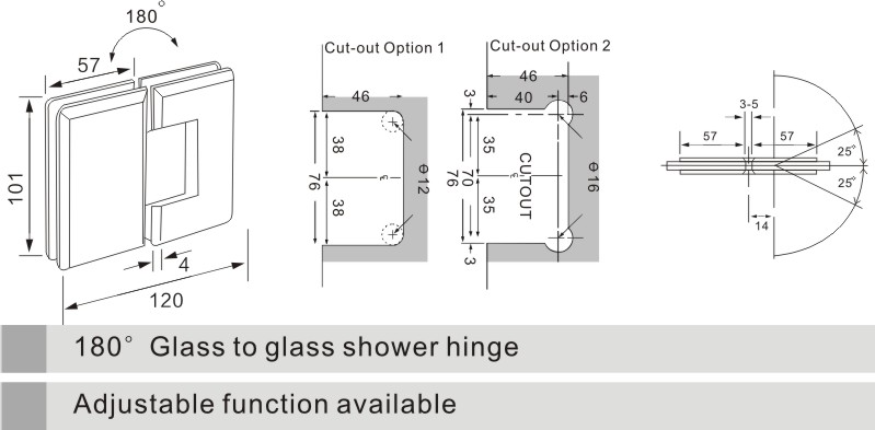 ● Glass to Glass 180°:8(5/16'')mm-12(1/2'')mm Glass